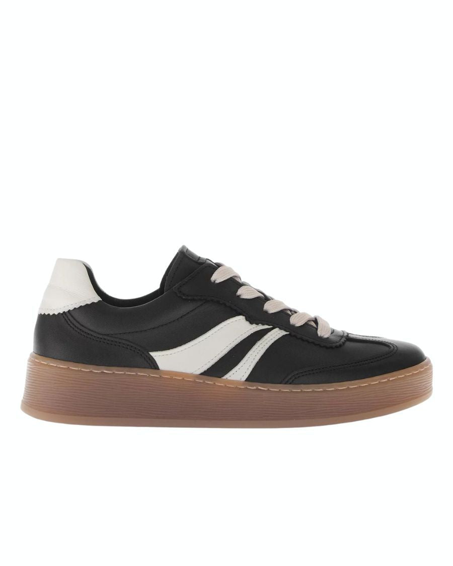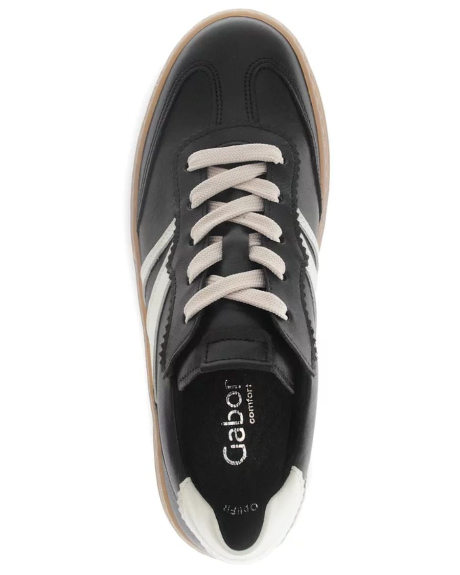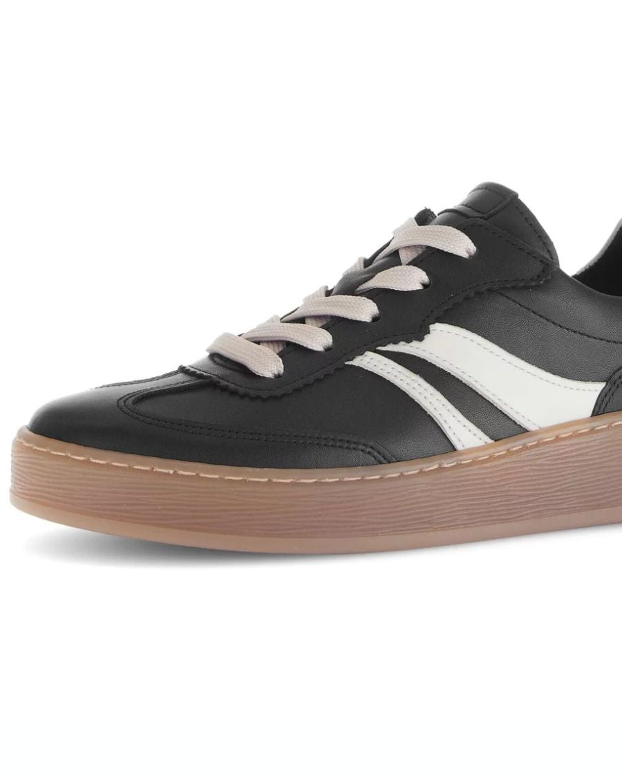Fabriquée en cuir noir lisse avec des empiècements en cuir blanc sur les côtés et au talon, cette création Gabor bénéficie d’un savoir-faire responsable grâce à l’adhésion de la marque au Leather Working Group. La doublure en microfibre douce et respirante offre un confort optimal, tandis que la semelle intérieure amovible, conçue avec des matériaux recyclés, procure un amorti supplémentaire tout en respectant l’environnement. Sa semelle extérieure tan avec talon de 3,5 cm assure une marche stable et agréable, et les lacets blancs permettent un ajustement sur mesure.