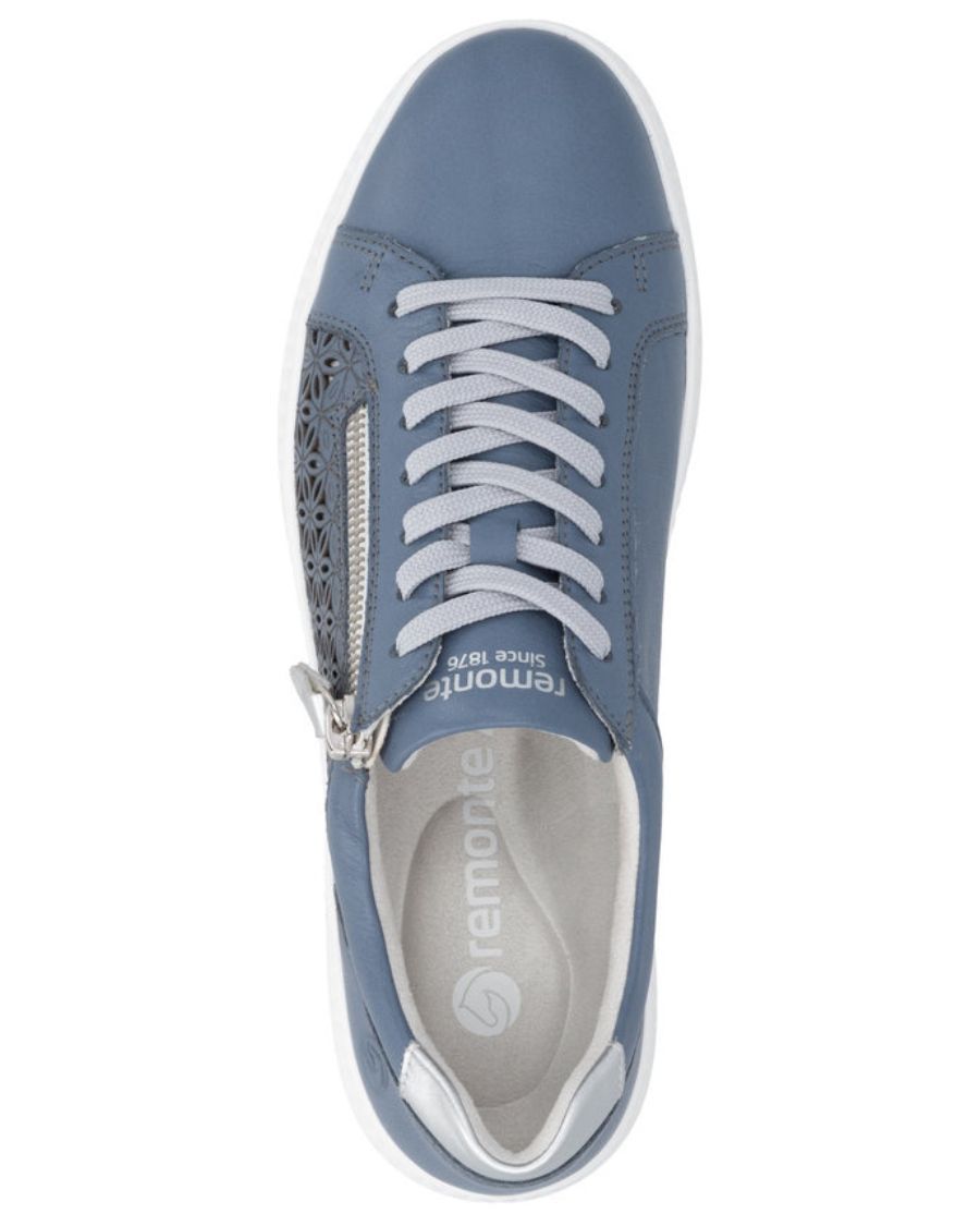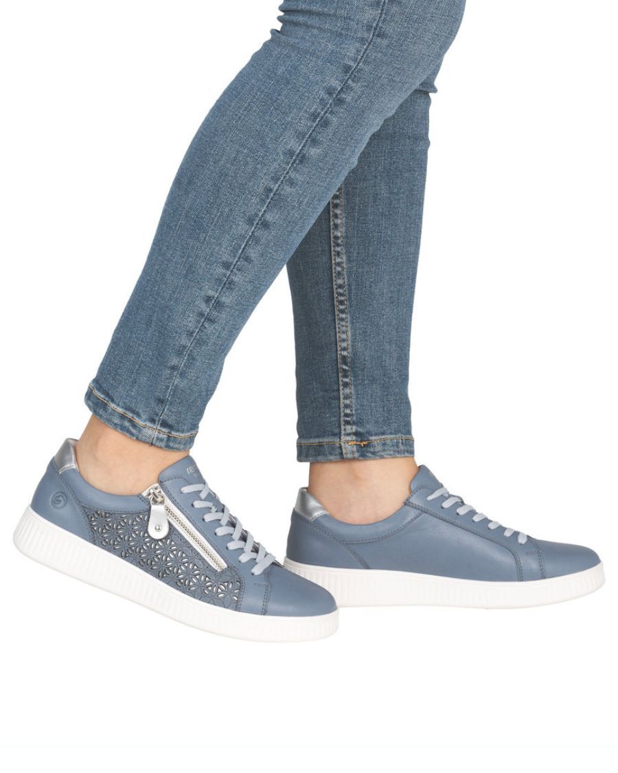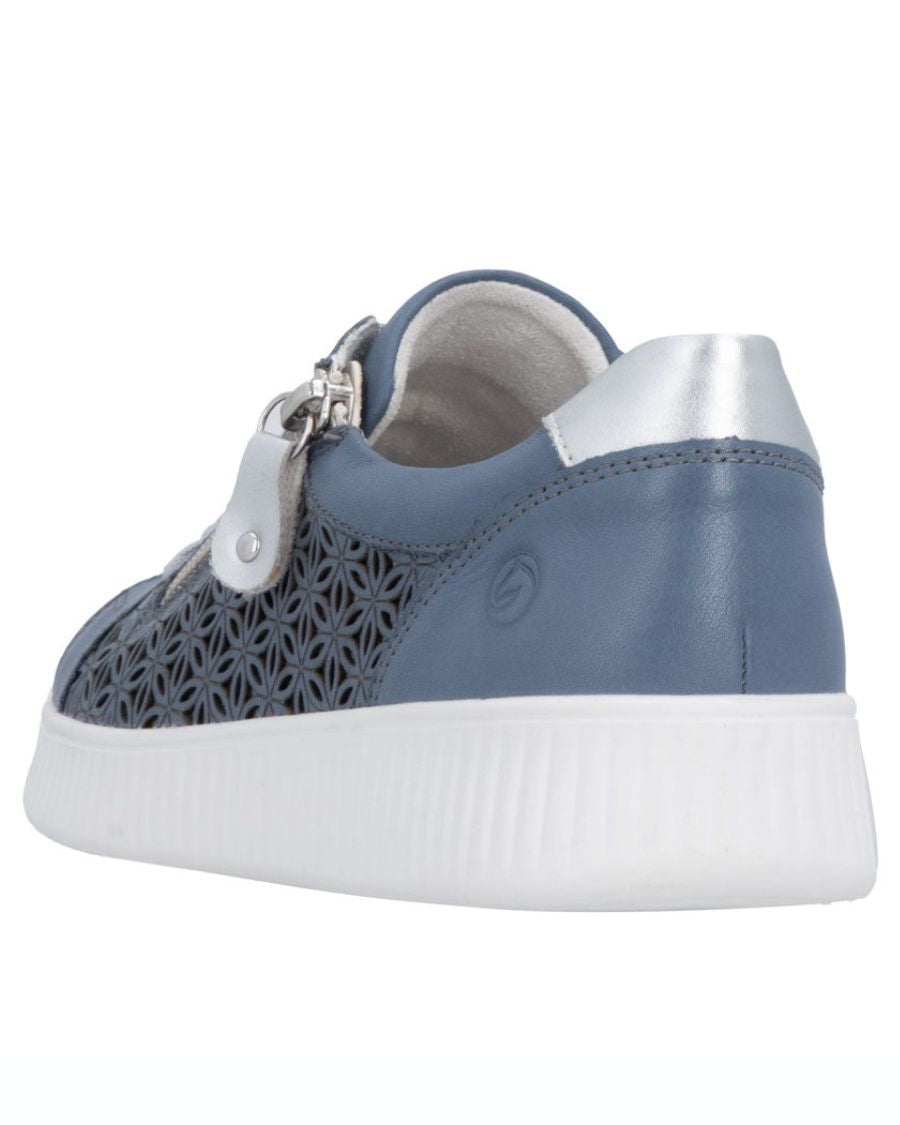 Prix régulier $149.95Pensée pour la femme active, la chaussure tout-aller bleue D2E03-14 de Remonte est une basket basse élégante et polyvalente, idéale pour accompagner les activités quotidiennes avec style. Son cuir lisse bleu, subtilement perforé de motifs floraux, est rehaussé d’un détail argenté au talon qui apporte une touche féminine et moderne, parfaite pour un look soigné sans effort.